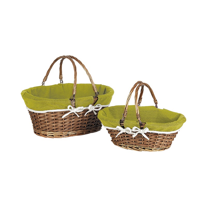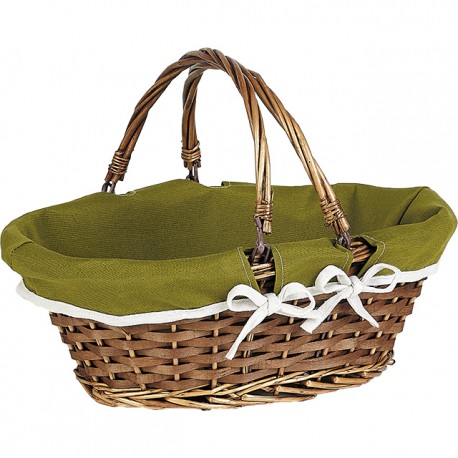 Panier ovale osier/bois beige tissu vert anses rabattables 35x27x13